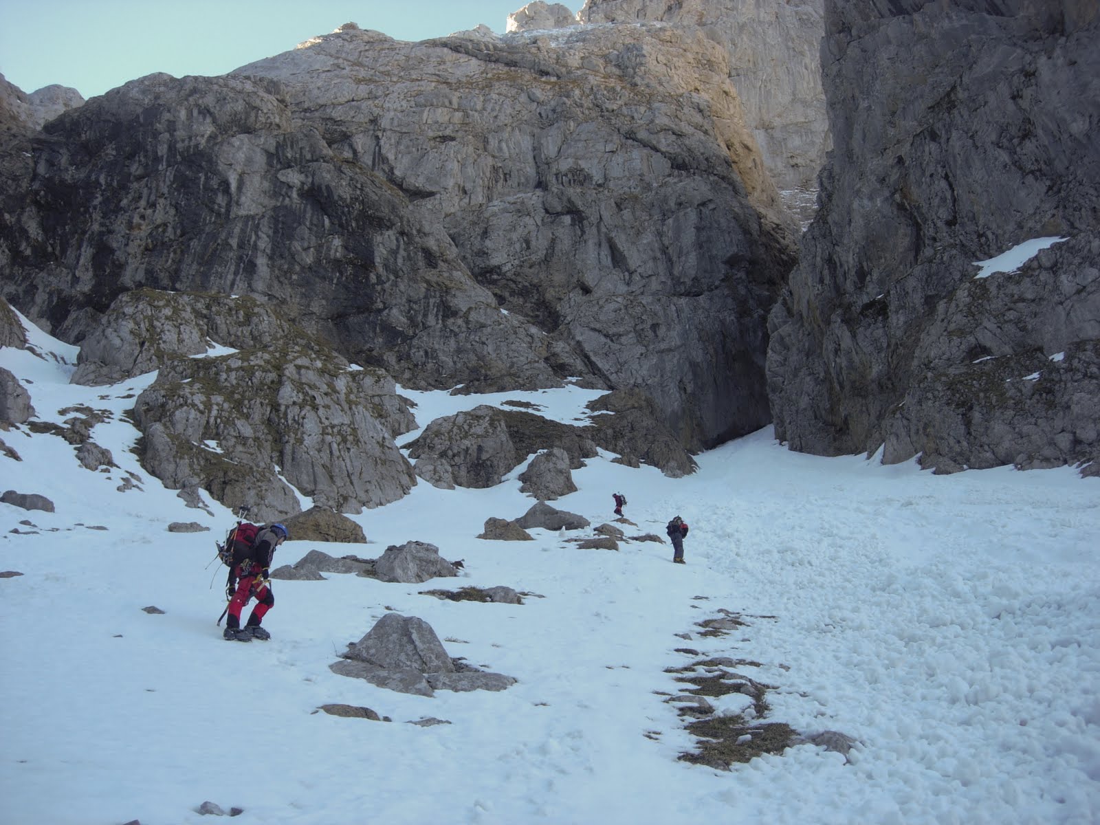 La subida a las vegas fue un agradable paseo y disfrutamos del amanecer viendo como el sol iluminaba la cara sur de Peña Santa. En Asotín descubrimos que no había nadie, para sorpresa nuestra. Una de nuestras preocupaciones era la presencia de más cordadas, por lo que retrasa la escalada. Hacía ya muchos años que habíamos escalado esta vía en unas condiciones demasiado “rocosas” y todavía teníamos presente el recuerdo de las dos horas que estuvimos esperando a que dos cordadas que llevábamos por delante pasasen el primer resalte. Al pie del corredor había un alud de las últimas nevadas y allí mismo nos pusimos todos los bártulos, incluidos los crampones.